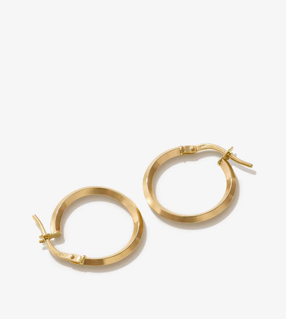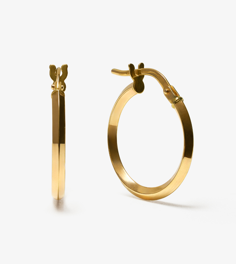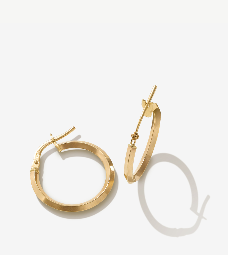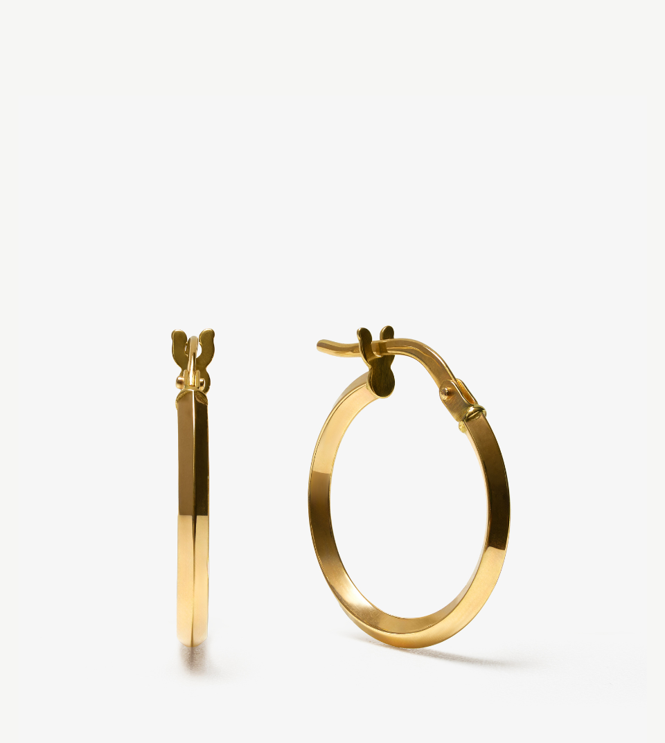 Specchio Hoops are a reinvention of the classic hoop. The hoop earrings feature a contemporary elegance of mirrored-edges with a high-polished shine. The result of a careful craftsmanship, they are designed in two styles: Small and Oval. Crafted in 9k yellow gold, they fasten with a bayonet clasp for maximum comfort and security, allowing you to wear them all day. Needless to say, an Essential in your jewellery box.