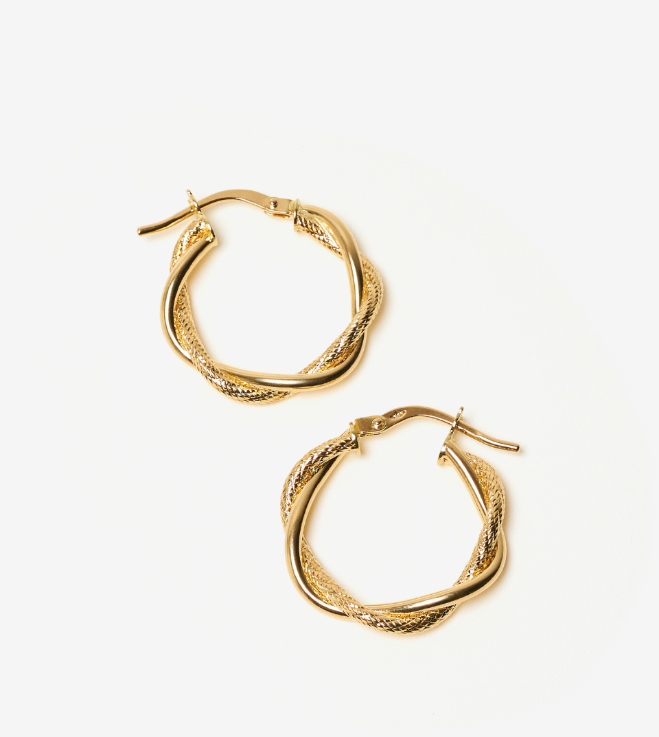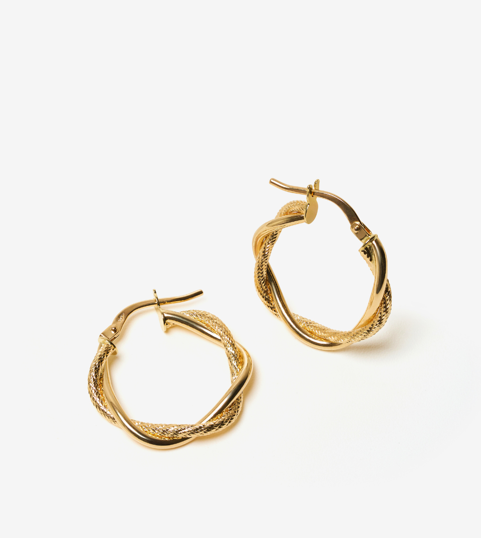 Infinity Hoops boast an intricate woven design of two contrasting gold textures. Result of careful craftmanship, one element, with a diamond-cut finish, wraps itself around a second element, of smooth high-polished gold.